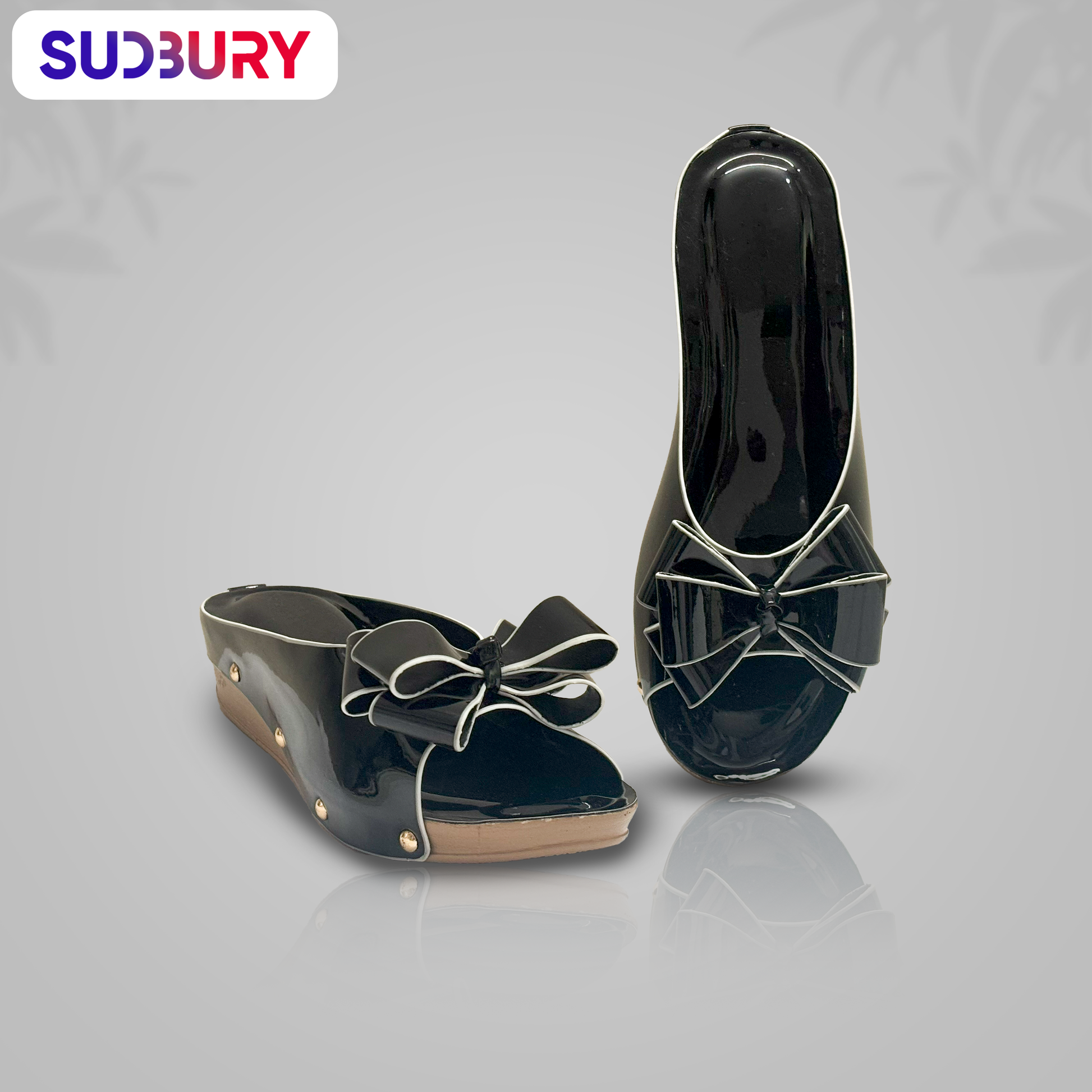 Step into elegance with the Sudbury MidnightBow Wedge Sandals. Featuring a glossy black finish, statement bow, and comfortable wedge heel, these sandals combine glamour with all-day comfort. Ideal for evening events, casual dinners, and festive occasions.